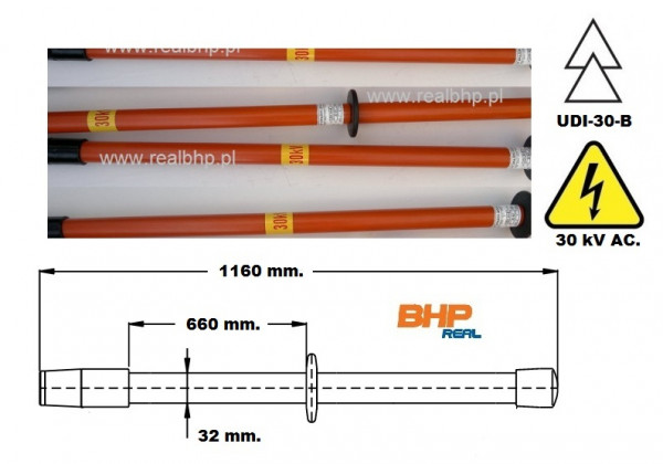 - uniwersalny drążek izolacyjny UDI-30-B przeznaczony jest do pracy przy urządzeniach elektroenergetycznych o napięciu do 30kV AC, izoluje pracownika od urządzeń elektrycznych będących pod napięciem i stosowany jest w rozdzielnicach i stacjach trafo niskiego i średniego napięcia
