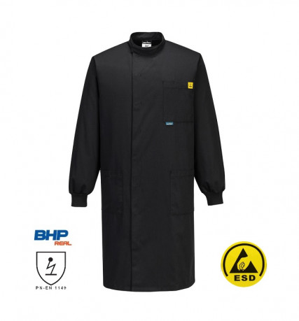 - antystatyczny fartuch ESD AS-15 przeznaczony do pracy przy wrażliwych urządzeniach i komponentach elektronicznych, zapobiega wyładowaniom elektrostatycznym ESD lub do ochrony pracownika znajdującego się w strefach zagrożonych wybuchem ATEX