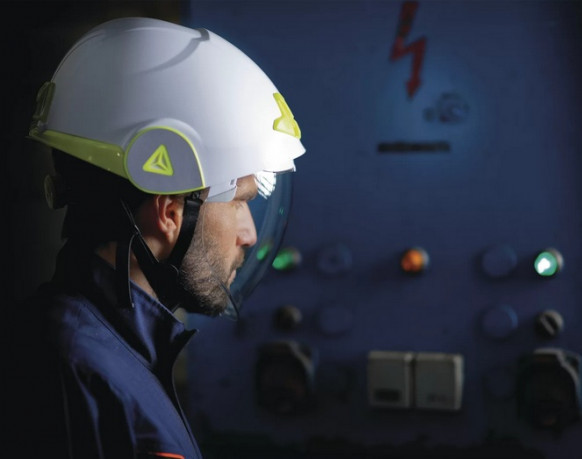 - elektroizolacyjny kask ochronny Onyx-2 z uchylną osłoną twarzy chroniącą przed łukiem elektrycznym oraz przed porażeniem elektrycznym zapobiegając przepływowi prądu przez głowę pracownika idealny do prac montażowych w instalacjach elektrycznych oraz liniach napowietrznych