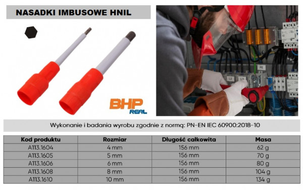 - nasadki imbusowe sześciokątne izolowane HNI oraz HNIL stosuje się do rozkręcania i skręcania śrub o łbach imbusowych w urządzeniach elektroenergetycznych oraz pojazdach elektrycznych PPN do 1000V AC/ 1500V DC