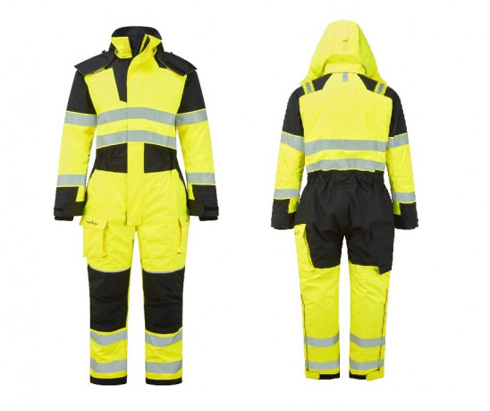 - ocieplany kombinezon PW-3 Hi-Vis trudnopalny i antyelektrostatyczny, ostrzegawczy o najwyższych parametrach ochrony przed  przed zimnem, wilgocią i wiatrem według normy  EN 342 0.343 (M².K/W) 2, X i najwyższej klasie wodoodporności EN 343 4:1X przeznaczony do pracy w trudnych warunkach atmosferycznych przy obsłudze urządzeń elektroenergetycznych PPN (fermy wiatrowe i solarne, stacje i rozdzielnie trafo)  gdzie występuje duże zagrożenie powstania zwarciowego łuku elektrycznego, dopuszczony do stref ATEX