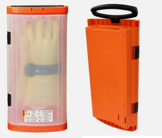 - pojemnik na rękawice elektroizolacyjne przeznaczony do miejsc gdzie pracownik ma styczność z urządzeniami elektrycznymi i występuje konieczność częstego stosowania rękawic dielektrycznych lub punktów pierwszej pomocy do ratowania porażonych prądem