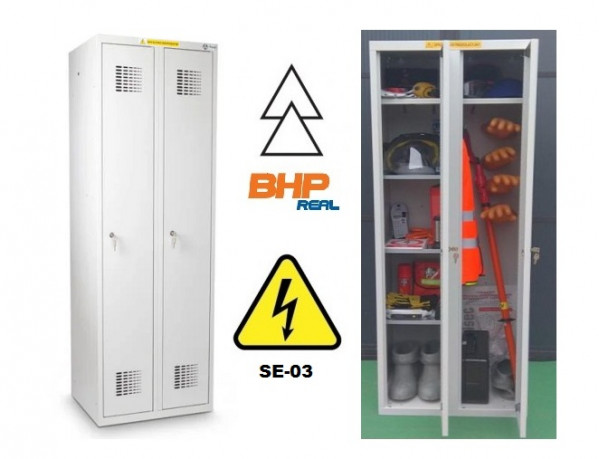 - dwudrzwiowa szafa metalowa SE-03 przeznaczona do przechowywania sprzętu elektroizolacyjnego bhp, środków ochrony osobistej, drążków izolacyjnych oraz uziemiaczy przenośnych w rozdzielnicach elektrycznych, stacjach transformatorowych niskiego NN, średniego SN oraz wysokiego napięcia WN