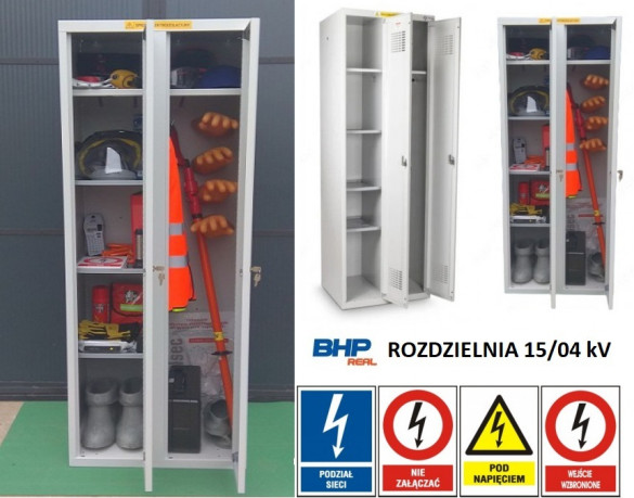 - szafa wyposażona w dwie komory : lewa z 4 półkami na drobny sprzęt typu chwytaki CHM, hełmy dielektryczne, wskaźniki napięcia, znaki elektryczne, obuwie elektroizolacyjne oraz zaczepy i prawa komora z półką oraz uchwytami na rękawice elektroizolacyjne, uziemiacze przenośne oraz odzież ochronną, drążki izolacyjne UDI i kleszcze KI do bezpieczników BM i osłon