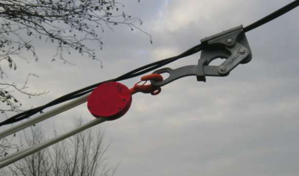 - uchwyt KL-6 do napinania przewodów izolowanych SN NN wykonany z utwardzonej stali z dwoma ruchomymi szczękami zaciskającymi się samoczynnie na naciąganych przewodach