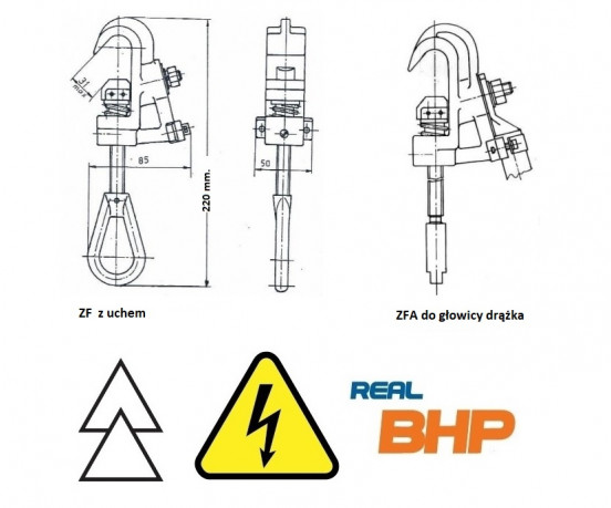 - uziemiacz zakładany na przewód za pomocą drążka elektroizolacyjnego o odpowiednim napięciu znamionowym oraz zaczepu manewrowego typu KD, ZU lub ZL ( wersja uziemiacza O-ZF/A zakładana na szyny i przewody tylko za pomocą drążka )