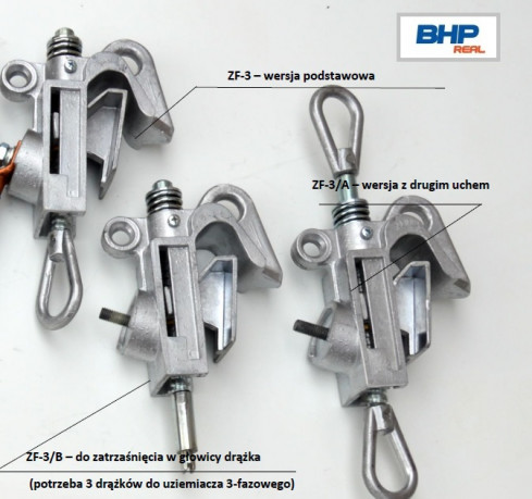 - zacisk uziemiacza produkowany w trzech wersjach: z uchem podstawowa O-ZF3, O-ZF3-A z dodatkowym górnym uchem do zakładania na przewody znajdujące poniżej montera oraz O-ZF3-B do mocowana w zatrzasku drążka izolacyjnego wyposażonego głowicą UDI