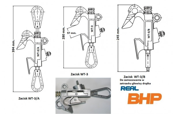 - zacisk WT-3/A mający dwa pokrętła przeznaczony jest do zakładania za pomocą drążka izolacyjnego i zaczepu manewrowego na przewody okrągłe znajdujące się nie tylko powyżej, ale także poniżej montera