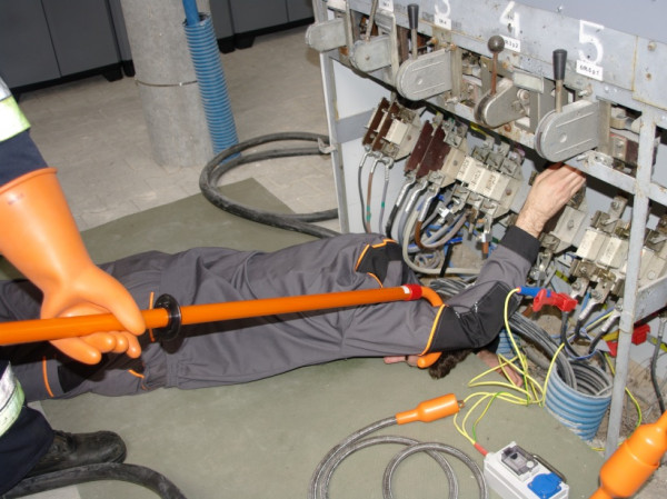 - rękawice elektroizolacyjne oraz hak ewakuacyjny 30kV z aktualnymi badaniami napięciowymi